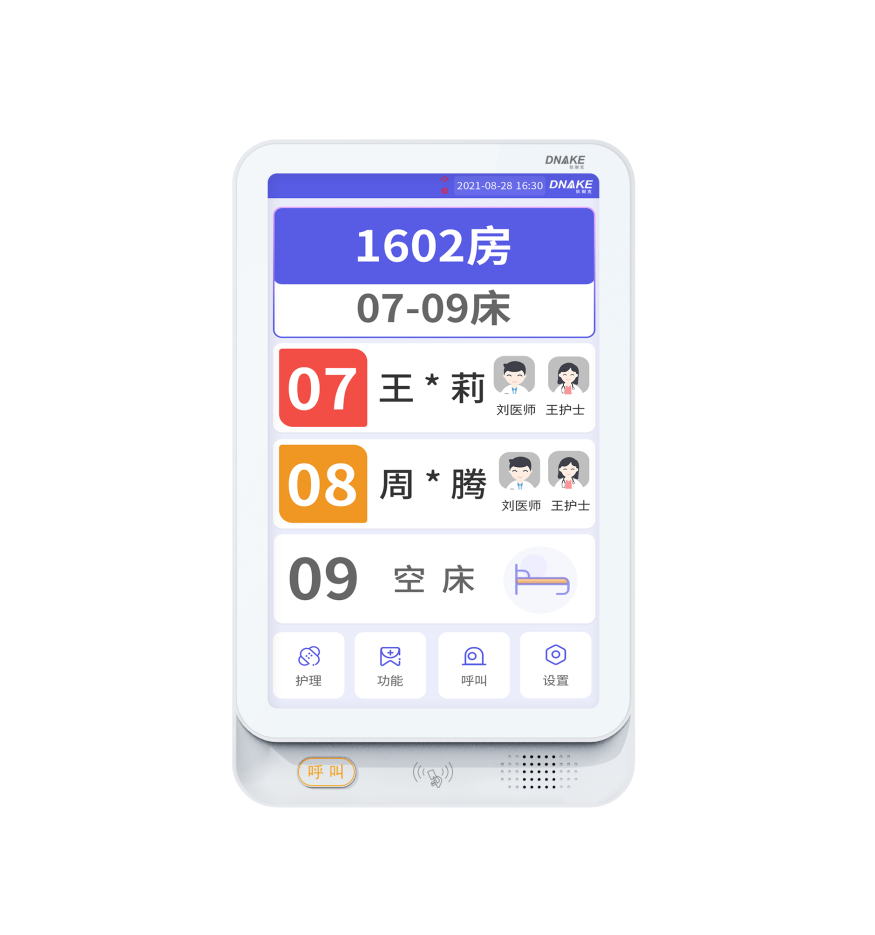 創(chuàng)新設(shè)置在病房門(mén)口的終端設(shè)備,主要用于顯示病房相關(guān)信息,內(nèi)置簡(jiǎn)易醫(yī)護(hù)工作站,支持病房床位一覽、患者動(dòng)態(tài)跟蹤、呼叫對(duì)講、增援求救等多種呼叫類(lèi)型,信息齊全,及時(shí)響應(yīng)醫(yī)護(hù)需求,實(shí)現(xiàn)智能化醫(yī)護(hù)管理。