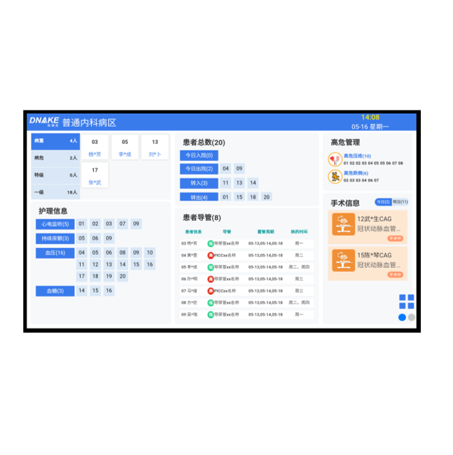創(chuàng)新主要部署于病區(qū)護士站,用于顯示區(qū)域病房內(nèi)病床相關(guān)信息,并對報警情況做出相對顏色塊提醒,同時伴隨醫(yī)護值班情況及安排等操作??娠@示科室病房的住院人數(shù)、空閑床位數(shù)、護理等級人數(shù)、護理交接班情況、值班的醫(yī)護人員以及要事留言,完全取代傳統(tǒng)記事板。軟件參數(shù):支持顯示出入院統(tǒng)計、 根據(jù)護理等級分類查詢不同患者的床位數(shù)和總?cè)藬?shù)、支持護理信息查詢不同床位、支持患者導(dǎo)管信息查詢