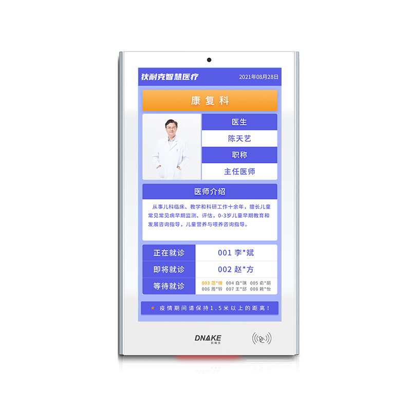 每個診室部署一臺液晶顯示終端,顯示出診專家(出診??啤⒔】敌痰龋┬畔?,診室叫號時全屏(或分屏)顯示需就診患者信息。