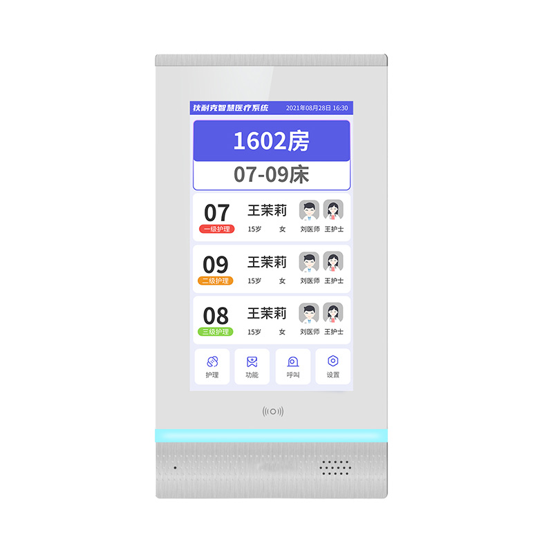 設(shè)置在病房門口的終端設(shè)備,主要用于顯示病房相關(guān)信息,內(nèi)置簡(jiǎn)易醫(yī)護(hù)工作站,支持病房床位一覽、患者動(dòng)態(tài)跟蹤、呼叫對(duì)講、增援求救等多種呼叫類型,信息齊全,及時(shí)響應(yīng)醫(yī)護(hù)需求,實(shí)現(xiàn)智能化醫(yī)護(hù)管理。