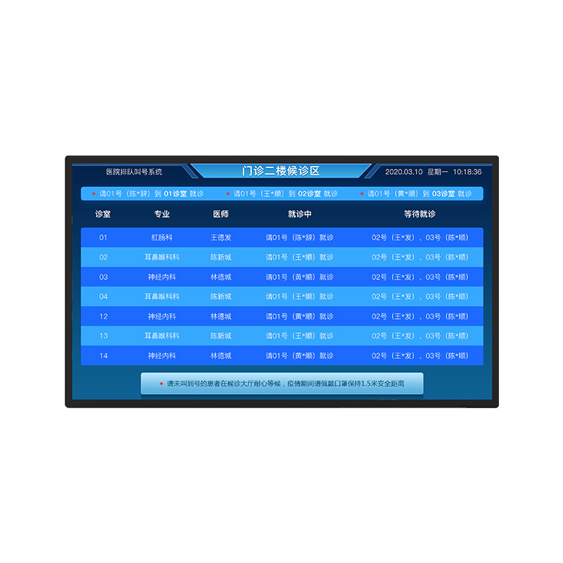 1)掛號(hào)大廳部署LED拼接電視墻,進(jìn)行屏幕劃分,分別顯示各科室目前有多少人排隊(duì),預(yù)計(jì)完成時(shí)間,掛號(hào)的多重病患的病人可以根據(jù)屏幕提示自主選擇看病次序。