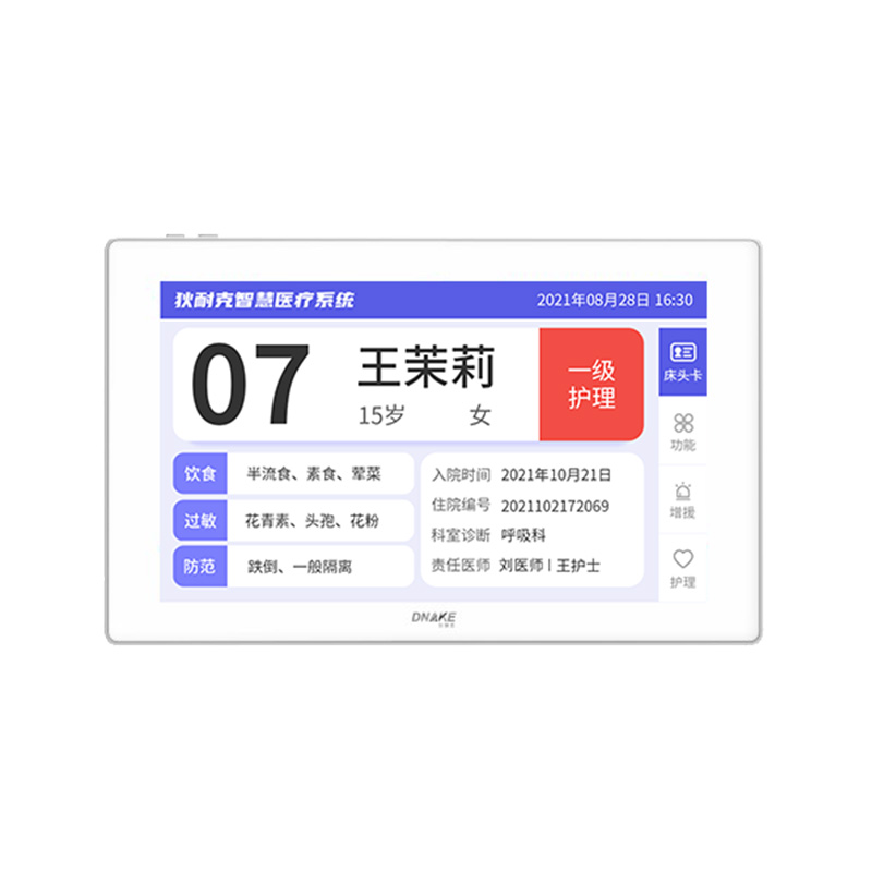 安裝在病床頭的交互設備機,代替?zhèn)鹘y(tǒng)紙質卡。產(chǎn)品支持呼叫對講、為住院患者提供病例查詢、狀態(tài)自動提醒等護理需求等。