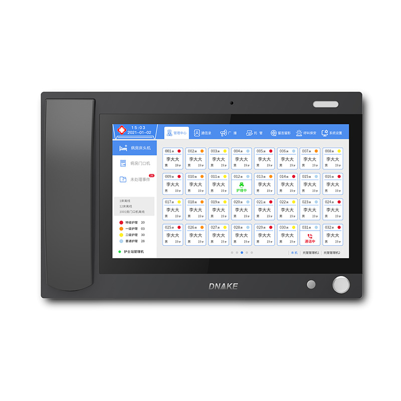 設(shè)置在護(hù)士站,可壁掛也可直接放在桌面上。主要接聽病區(qū)內(nèi)病床分機(jī)的呼叫以及患者信息查詢、廣播等基礎(chǔ)應(yīng)用功能,減輕醫(yī)護(hù)人員來回跑動的無效勞動和壓力,及時響應(yīng)患者需求,并做好醫(yī)護(hù)信息管理。